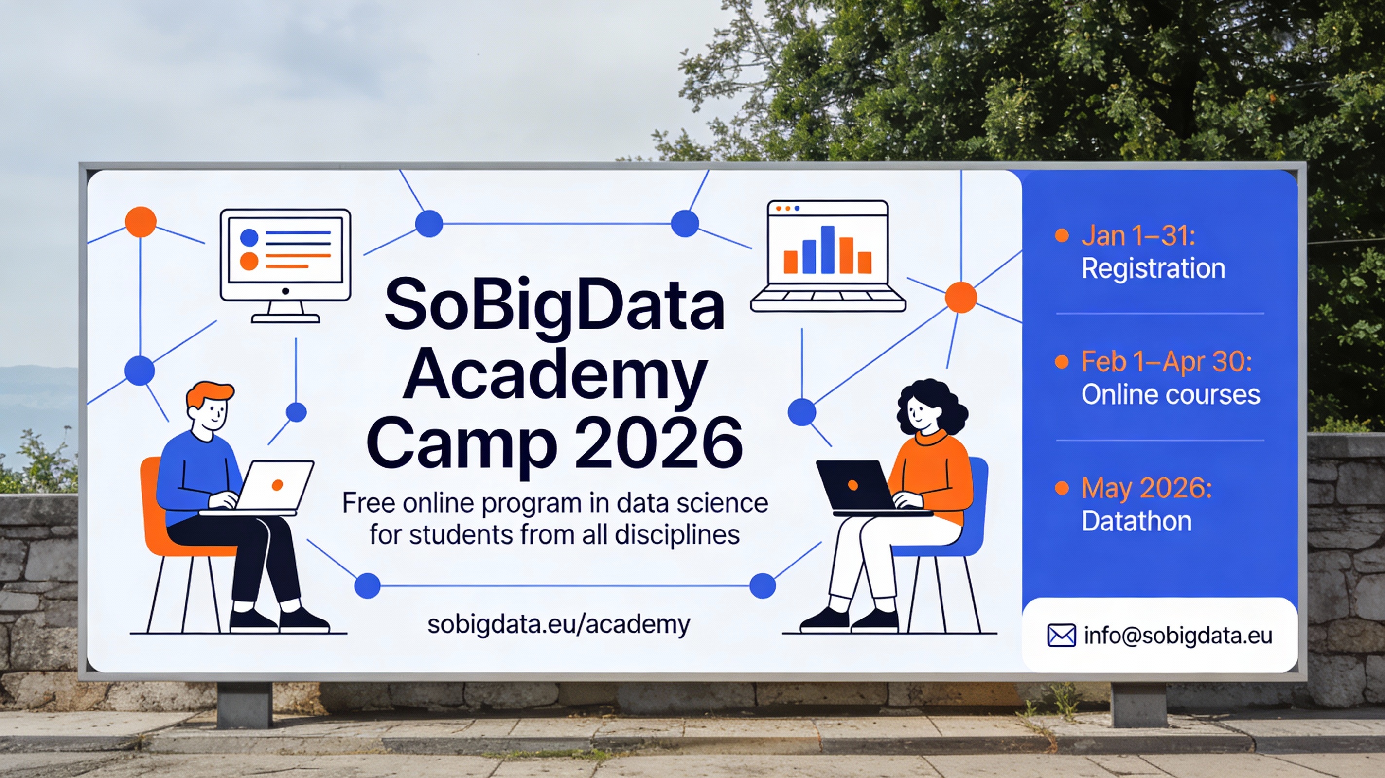 We invite your organization to share the SoBigData Academy Camp 2026, a two-and-a-half-month free online learning program designed to make data science accessible to students in all academic fields, from social sciences to law, humanities, and business. For more information, visit https://sobigdata.eu/academy .